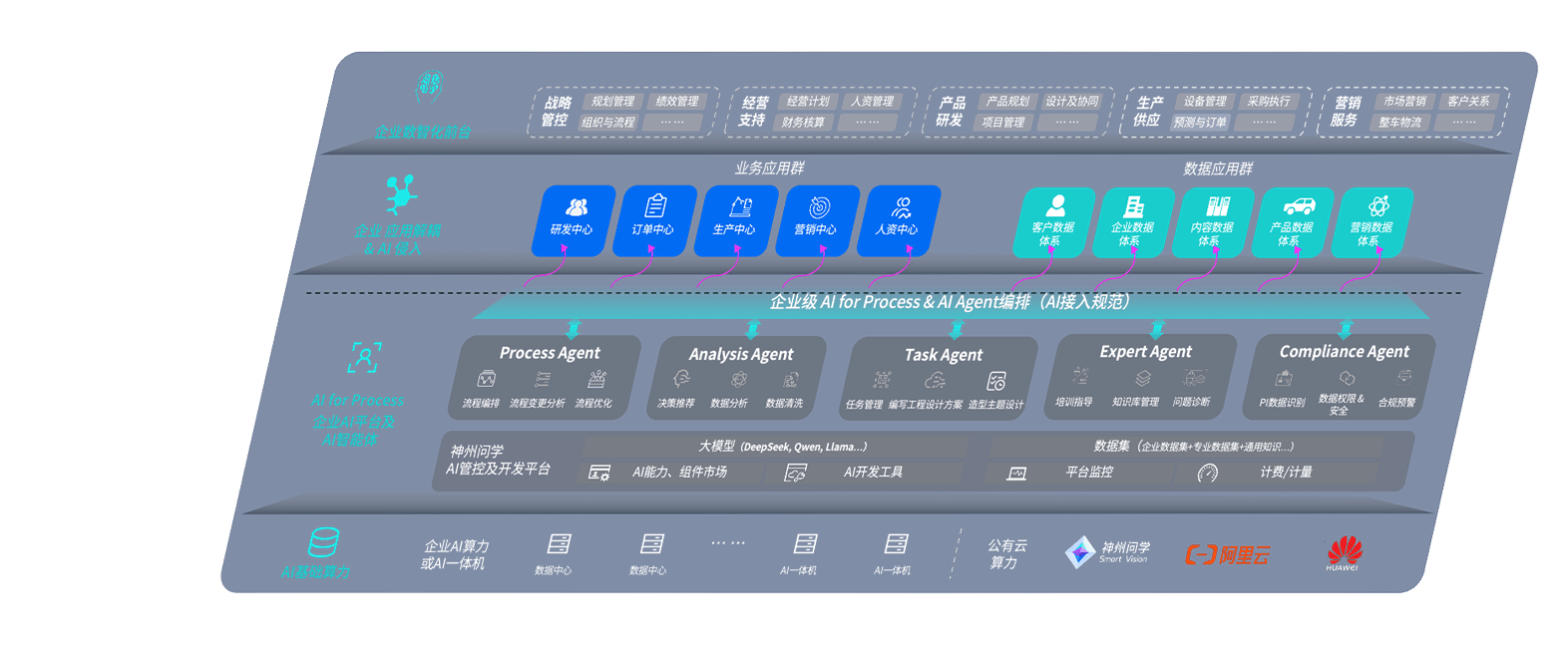 端到端的一站式AI工作空间深度融合了从企业战略规划到日常经营的全流程业务板块,,定向解决车企内部领域多、、、、部门多、、、链条长、、、、场景碎片化等难题,,,支持车企快速构建以AI为核心的生产力写作体系,,,,实现任务执行与AI能力的无缝集成与交互