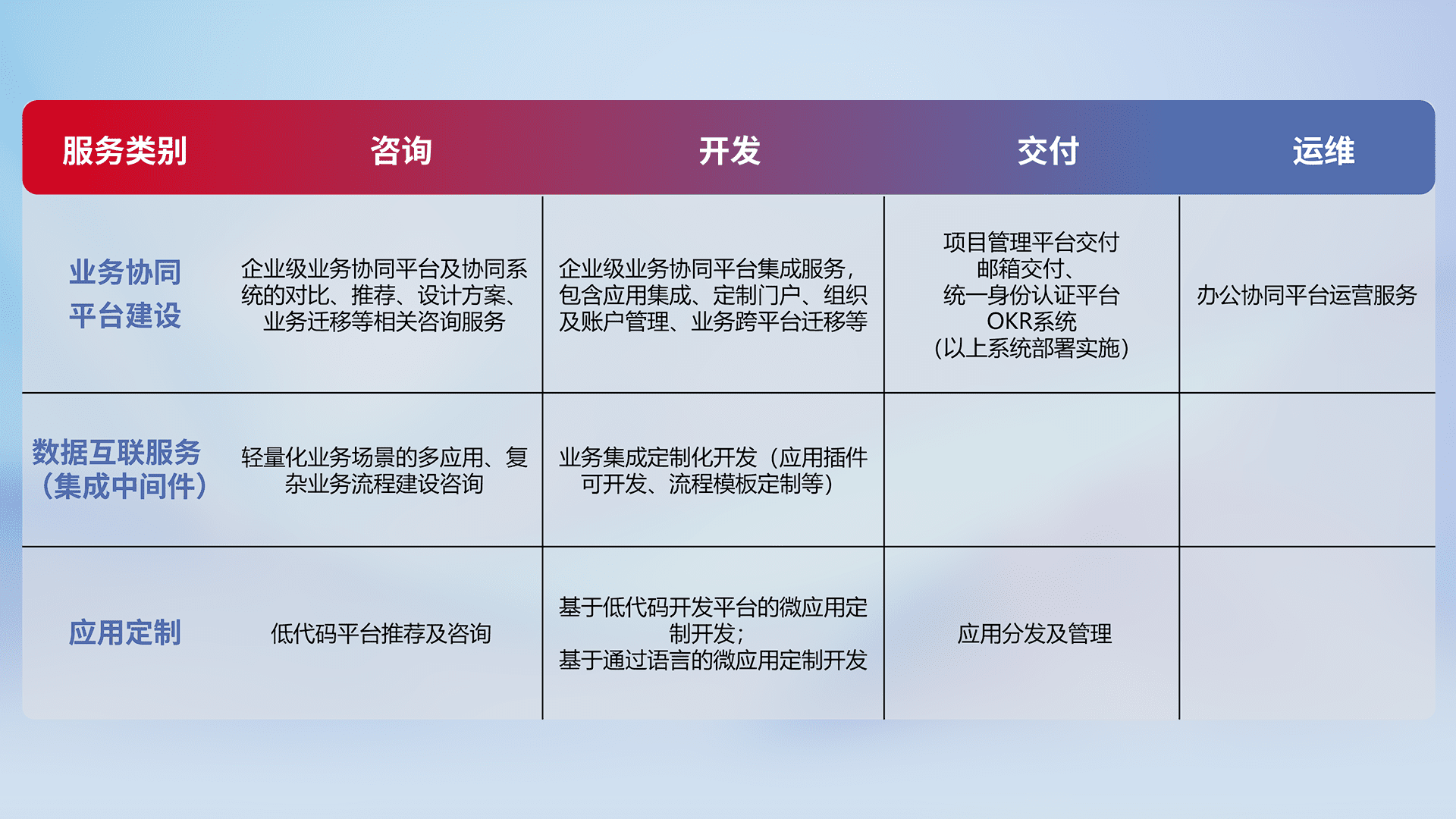 针对钉钉、、、、企微、、IDaas等平台级产品提供产品的规划、、、、方案、、、、交付、、、、定制化开发等服务,,实现如统一协同办公、、、智能客户服务、、混合会议管理、、、、智能数据查询、、、、等业务场景,,,,实现数字化转型。。